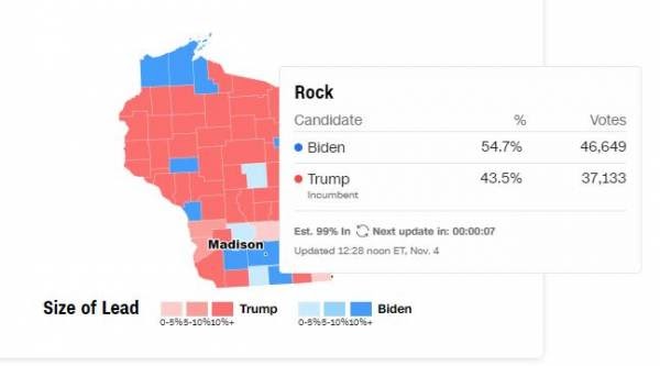 Vào lúc 11:21 kết quả này không thay đổi nhiều. Sau đó, đến lúc 11:43 rất nhiều phiếu bầu bổ sung đã đến cho thấy TT Trump đã dẫn đầu cuộc đua với 46.649 phiếu so với 37.133 phiếu của Biden, tương đương 9,516 phiếu bầu dẫn trước cho ông Trump.