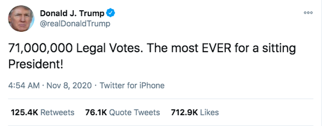 Trên Twitter, Tổng thống Trump đăng một số tweet tuyên bố ông được 71 triệu phiếu hợp lệ và là tổng thống đương nhiệm đầu tiên giành được số phiếu bầu nhiều như vậy. Bên cạnh đó, Tổng thống Trump tố cáo việc các quan sát viên không được cho vào phòng kiểm phiếu và nói hàng triệu phiếu qua thư đã được gửi cho những người không yêu cầu.